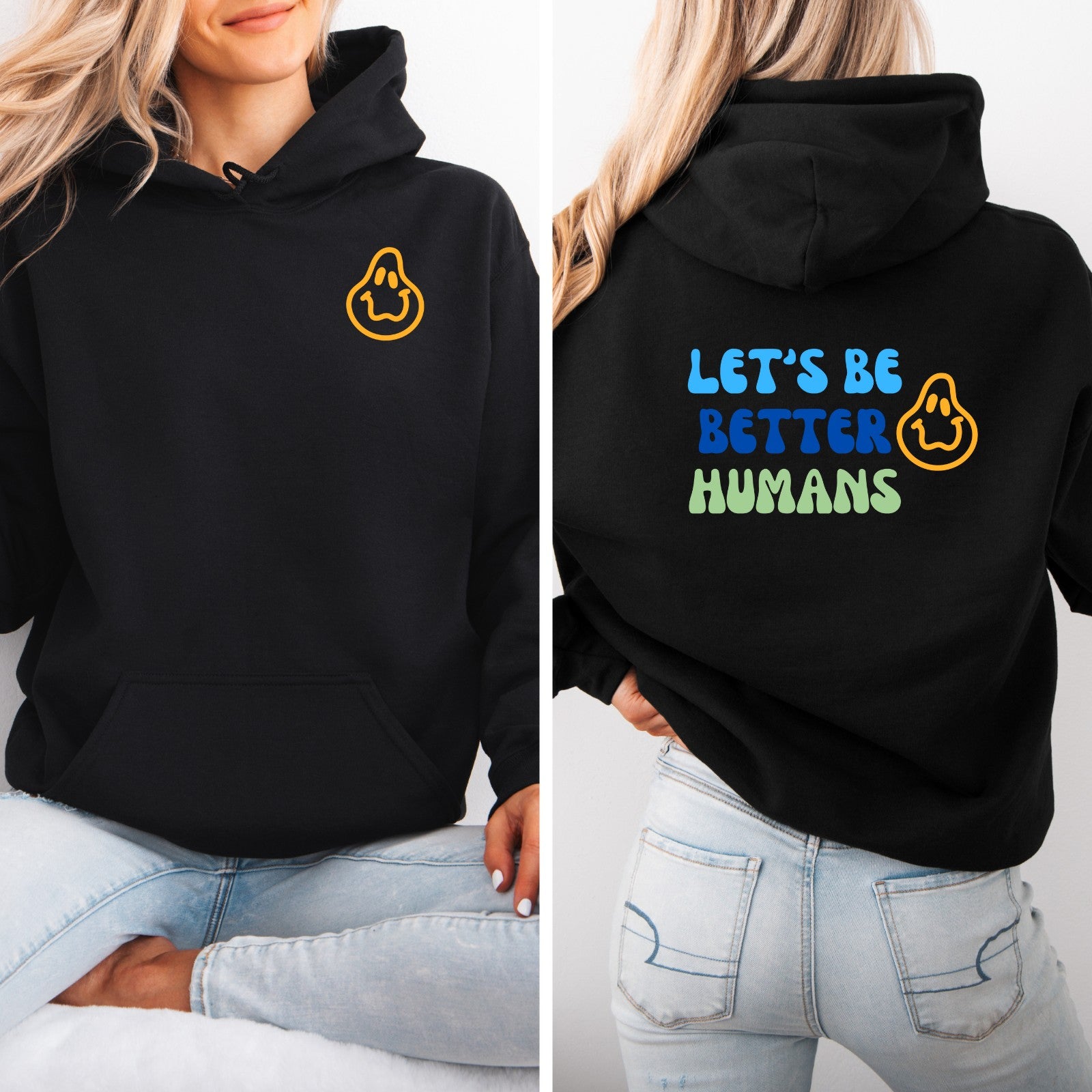 This Let's Be Better Humans Hoodie is made with a blend of 50% cotton and 50% polyester, ensuring a soft and durable material. The pouch pocket and double lined hood add convenience and warmth. Stay comfortable and stylish while promoting positivity and self-improvement.